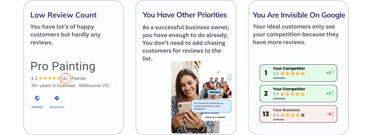 Our simple, three-step process takes the hassle out of collecting Google reviews, so you can focus on running your business while we handle the rest.